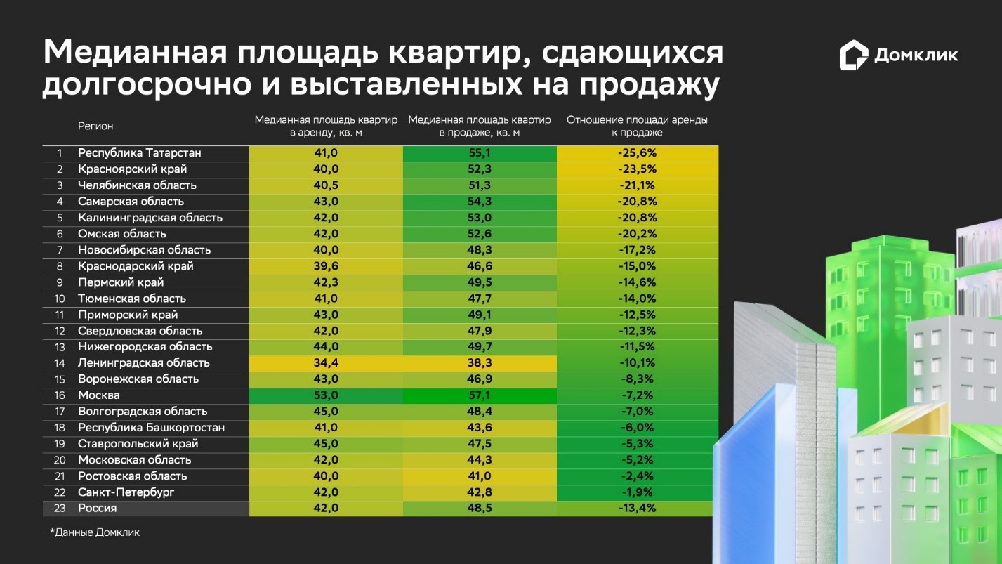 В большинстве крупных регионах квартиры, выставленные на продажу, просторнее арендных. В среднем по России медианная площадь арендного лота составляет 42 кв. м – это на 13,4% меньше, чем у жилья в продаже (48,5 кв. м).