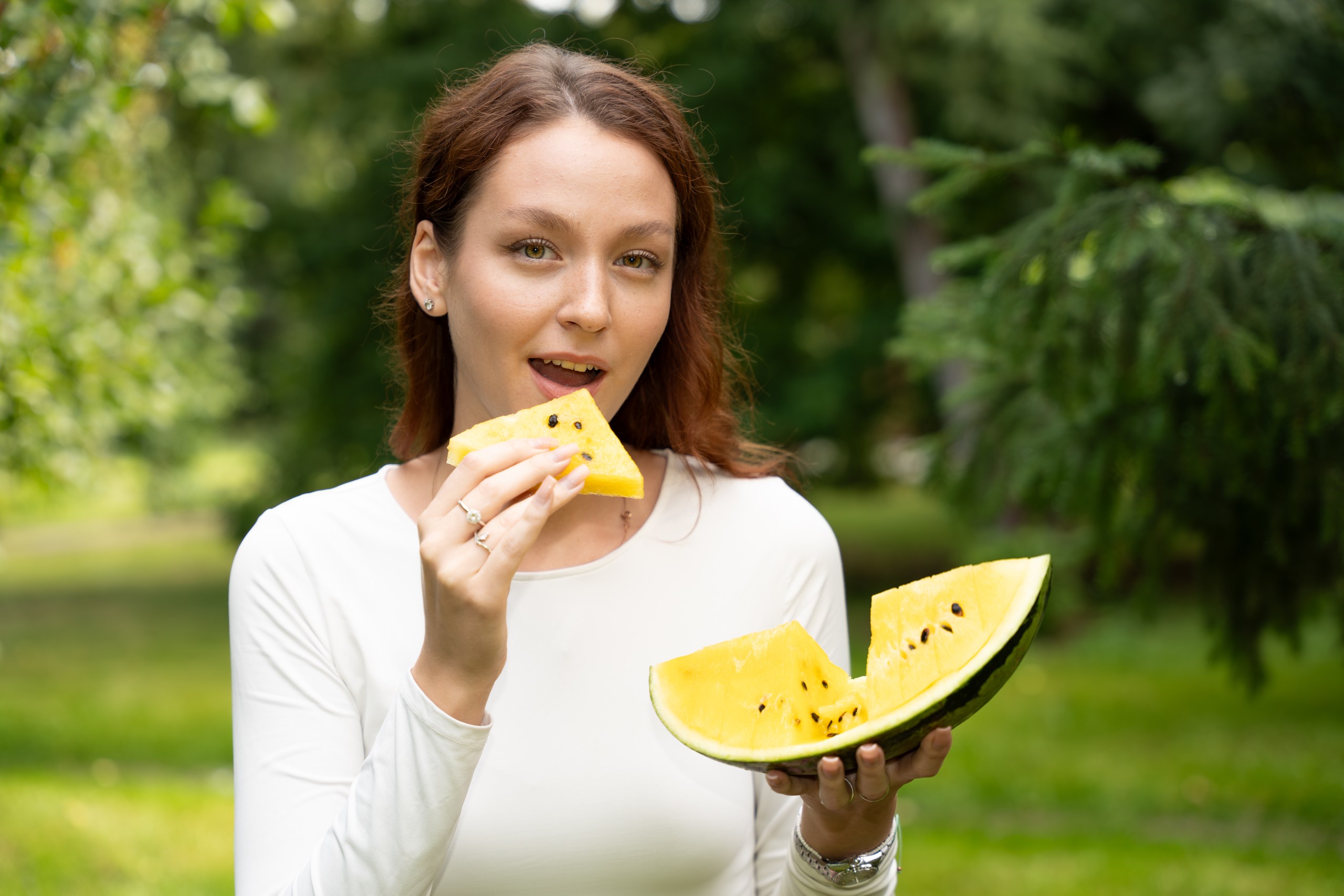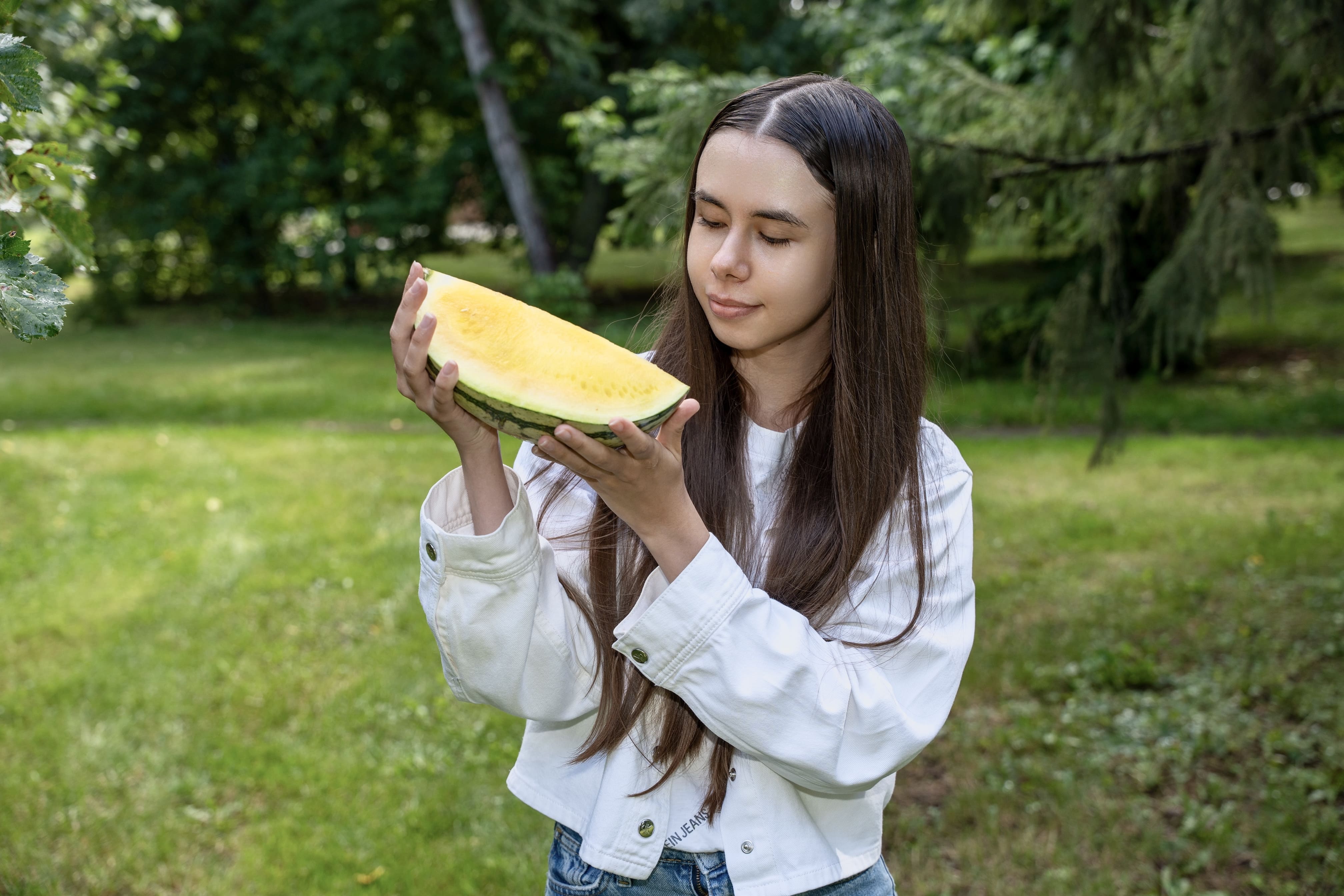 Лейсан выбрала жёлтый бессемянный арбуз — солнечный, сочный и необычный. Его мякоть ярко-жёлтая, с нежной сладостью и ароматом, который сразу ассоциируется с летом. Косточек почти нет.