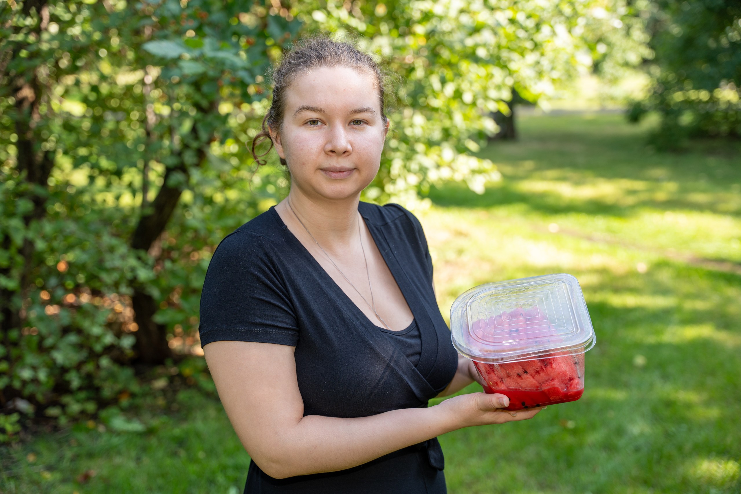 Аниса взяла арбуз в контейнере — аккуратно нарезанная сердцевина, самая красная и сладкая часть. «Удобно, что не нужно возиться с ножом и кожурой: открыла коробочку и сразу ешь самое вкусное», — отметила она.