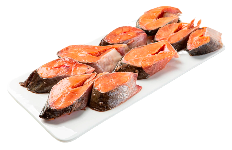 Кусочки горбуши в тонкой ледовой глазури, уже очищенные от требухи и чешуи. Подходят для жарки на сковороде, тушения и запекания в духовке.