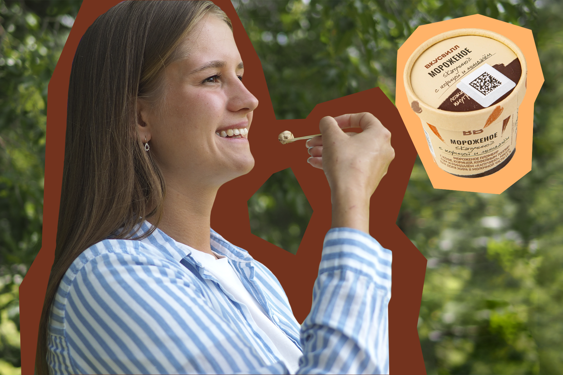 “Классический нежный пломбир со сливочно-ванильным вкусом. А выглядит прямо как в детстве! Удобная упаковка – не страшно уронить, не капает, порция небольшая. То, что нужно для ребёнка”, – говорит Алина Алмакаева.