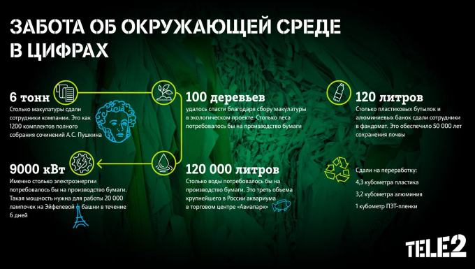 Tele2, российский оператор мобильной связи, подвел первые итоги экологического проекта для сотрудников. Специалисты компании сдали 6 тонн макулатуры, 4,3 кубометра пластика, 3,2 кубометра алюминия и кубометр ПЭТ-пленки.