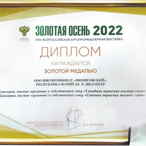 В категории «Мясная продукция и деликатесы» конкуренция была самой серьезной, здесь серебряная или бронзовая медаль – уже огромный успех. Но представители агрохолдинга «Звениговский» ехали в Москву только за победой. Натуральная качественная продукция торговой марки, которую заслуженно называют народной, принесла предприятию сразу 10 золотых медалей! За такой успех делегация республики Марий Эл была удостоена диплома «За активное участие в работе выставки «Золотая осень – 2022» и Гран-при «За вклад в развитие выставки».