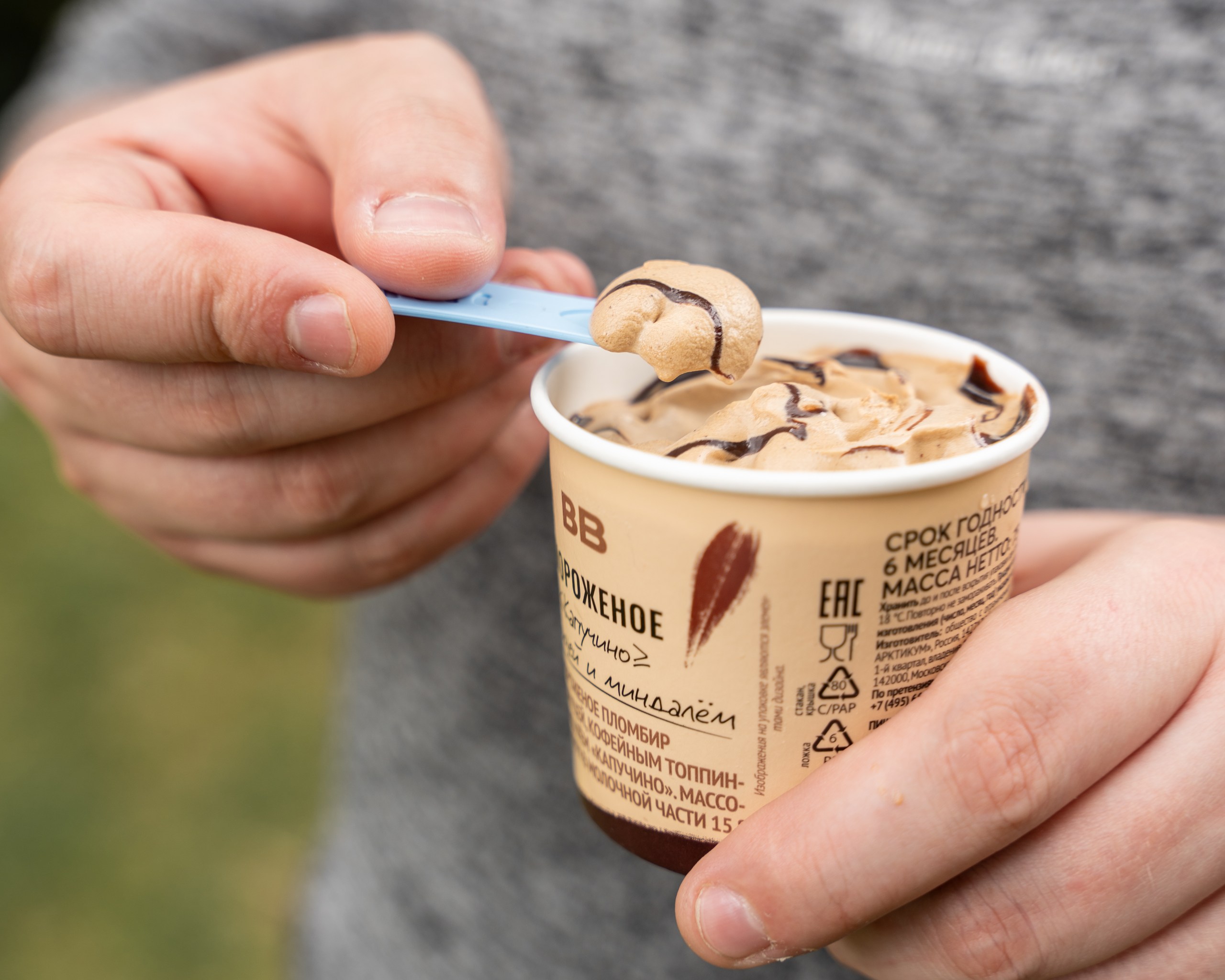 "Ароматный капучино в формате мороженого! Сливочная нежность, терпкость кофе, изысканные ноты корицы и хрустящий миндаль создают идеальный десерт для бодрящего и освежающего эффекта даже в самый знойный день".