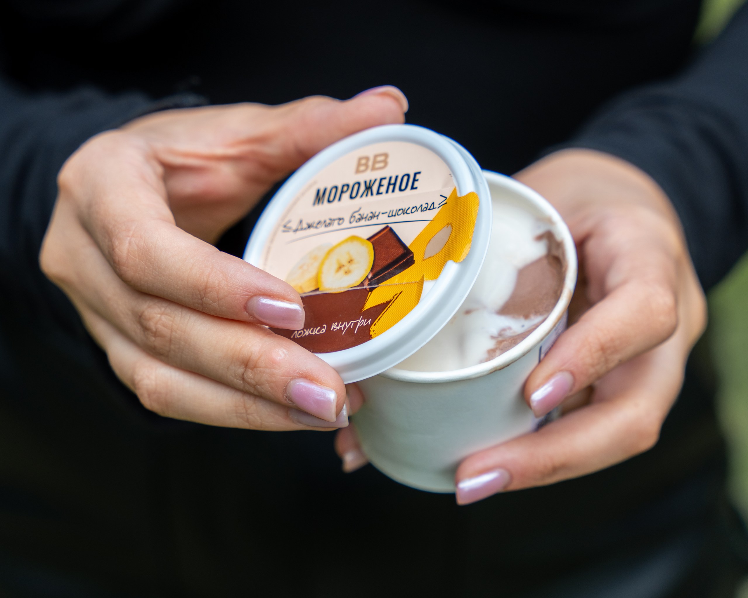 "Необыкновенное двухслойное мороженое с текстурой карамельных ирисок. Одна половинка — банановое джелато, другая — шоколадное. Вкус просто невероятный, а компактная ложечка в крышке делает его удобным для наслаждения на ходу".