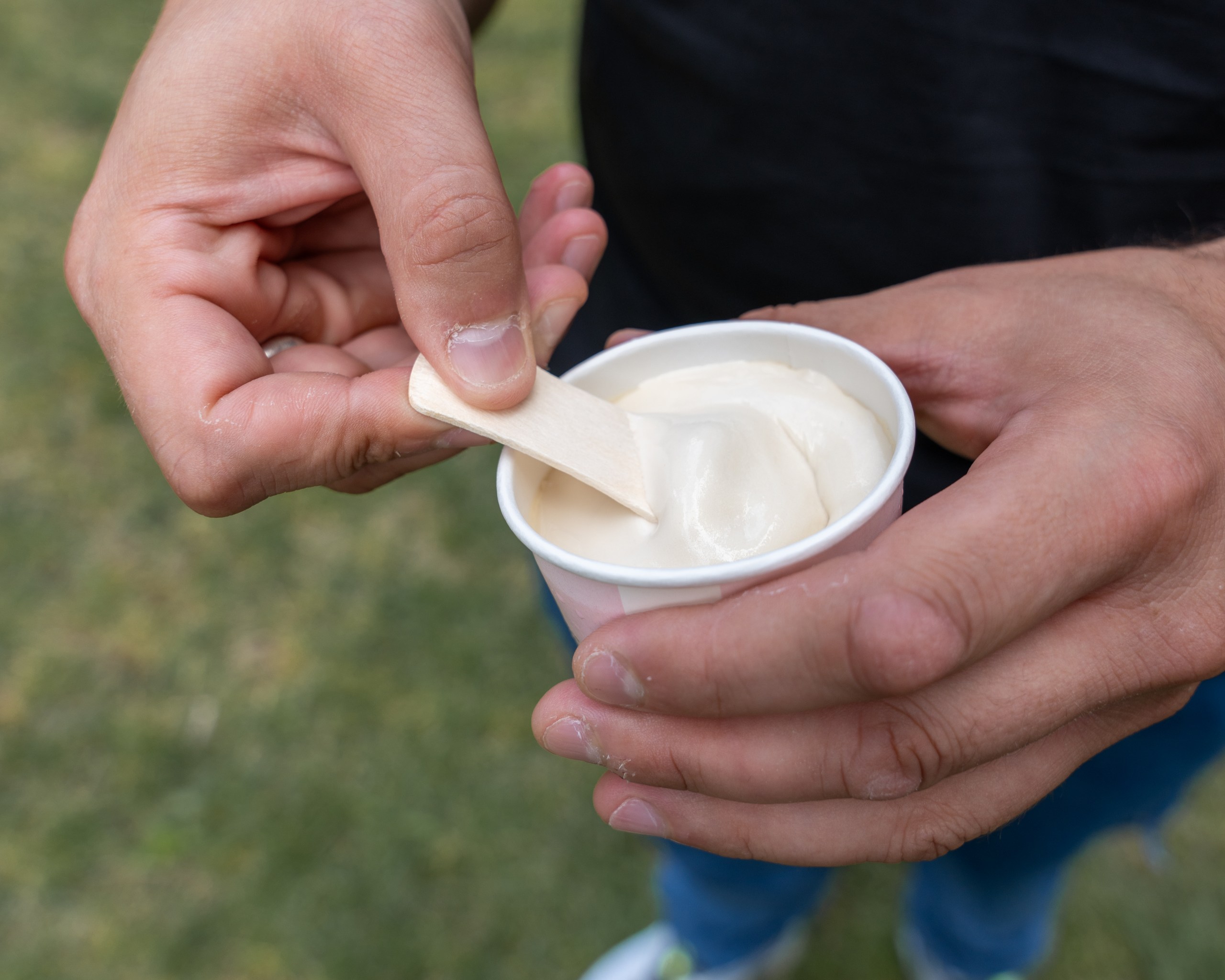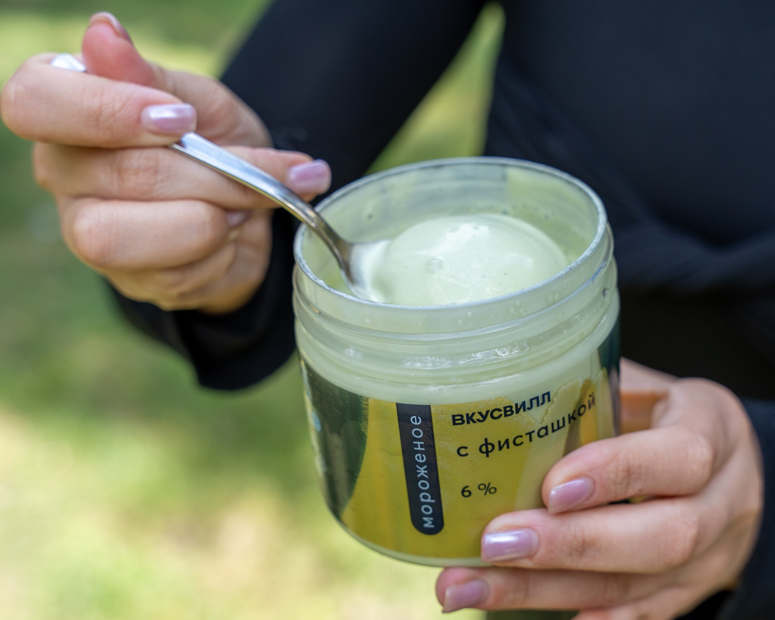 "Свежесть йогурта и сливочность классического пломбира в этом мороженом просто бесподобны. Тонкие кисломолочные нотки идеально сбалансированы шелковистой сладостью цветочного мёда и гурманскими нотами миндаля. Большая упаковка позволяет наслаждаться этим лакомством вместе с близкими — действительно, десерт для всей семьи".