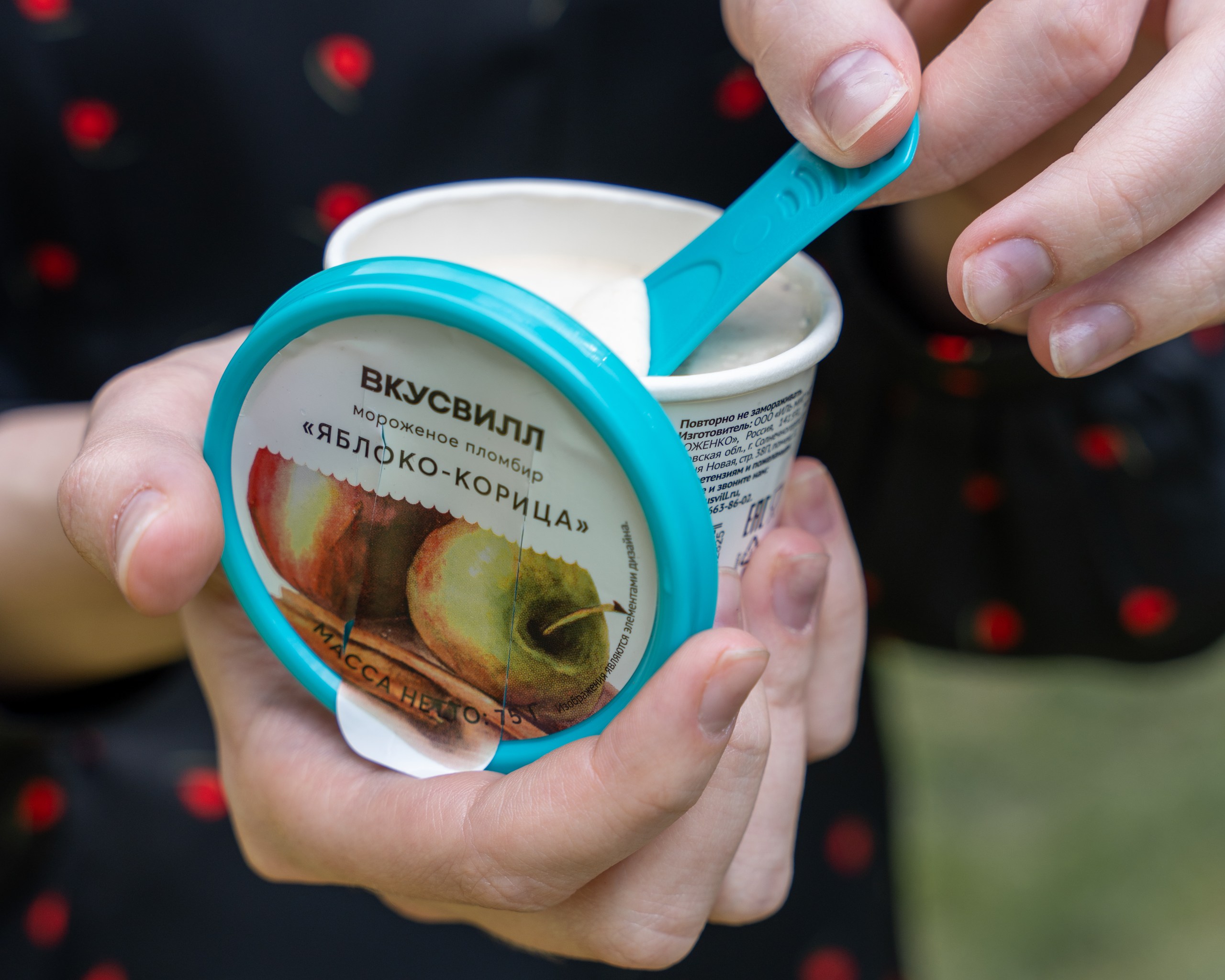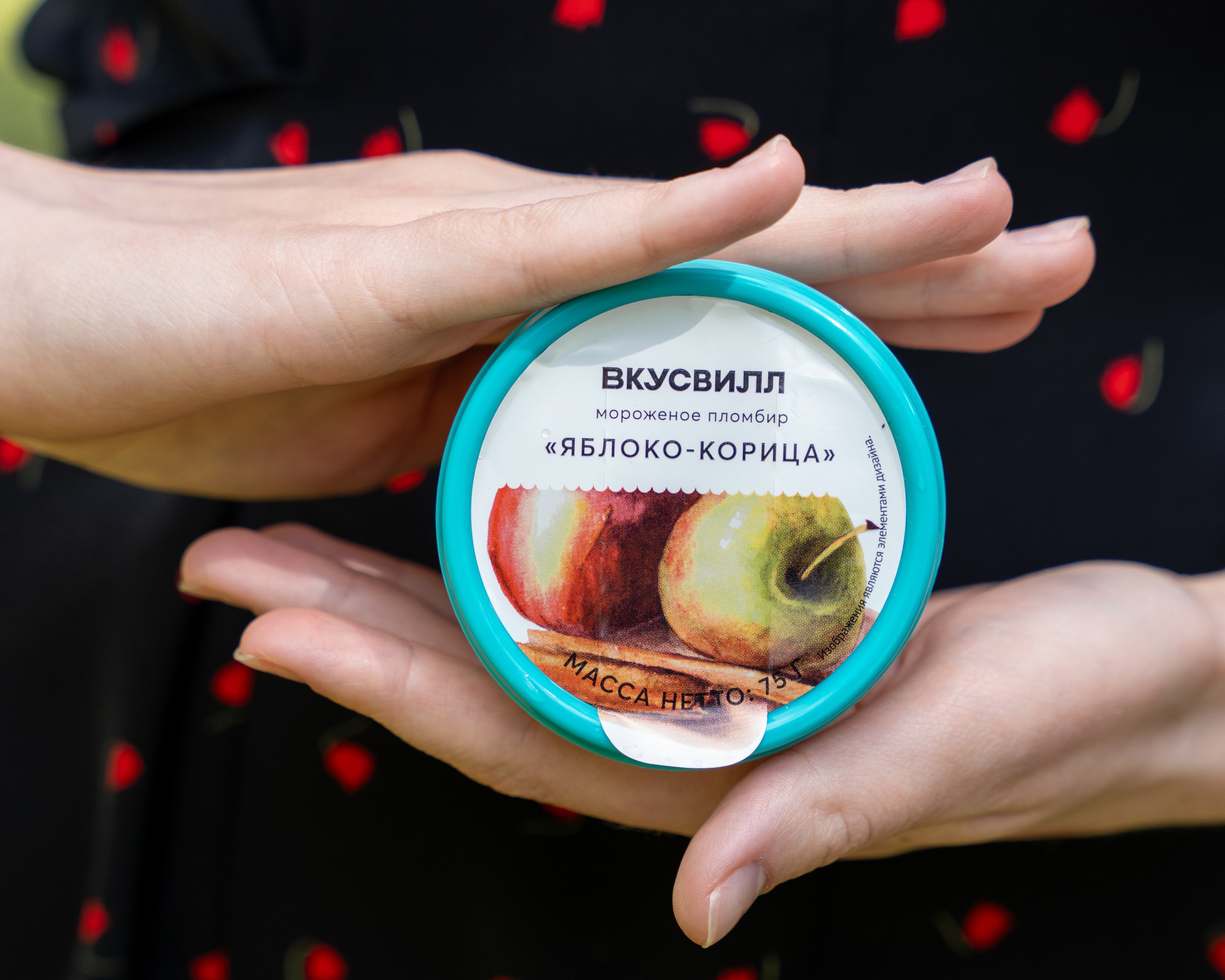 "Этот пломбир напомнил мне о яблочном пироге. Сливочный вкус с благородными фруктово-пряными нотками яблока и корицы. Идеально для долгих летних прогулок или в сочетании со свежей шарлоткой".